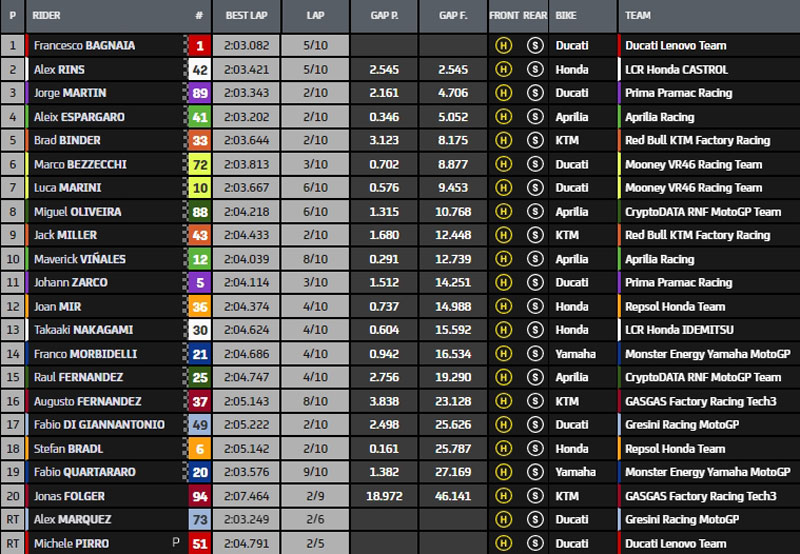 Nouveau top10 à mi course : Bagnaia, Espargaro, Rins, Martin, Marquez, Zarco, Binder, Bezzecchi, Marini et Oliveira