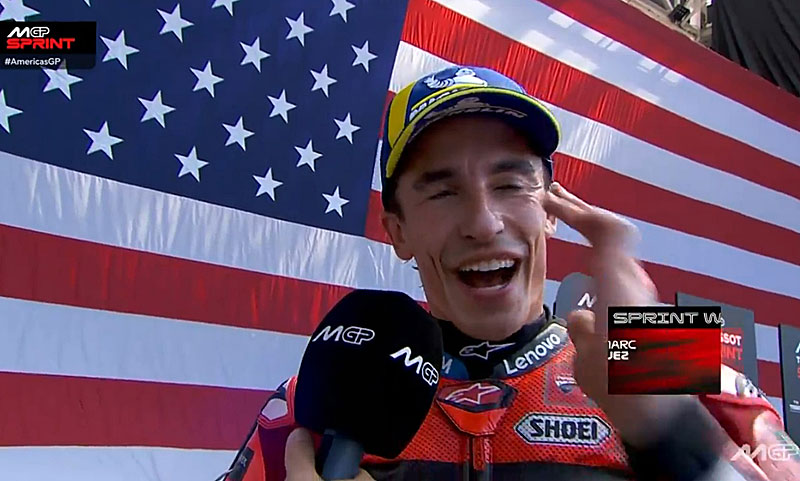 A peine descendu de sa Ducati GP25 du team d’usine Ducati Lenovo après avoir remporté le Sprint du Grand Prix des Amériques MotoGP 2025 sur le Circuit Of The Americas à Austin, Marc Marquez s’est confié devant les caméras du site officiel MotoGP.com avec la joie de poursuivre sa progression sans faute, même si cette fois cela n’est pas passé loin…