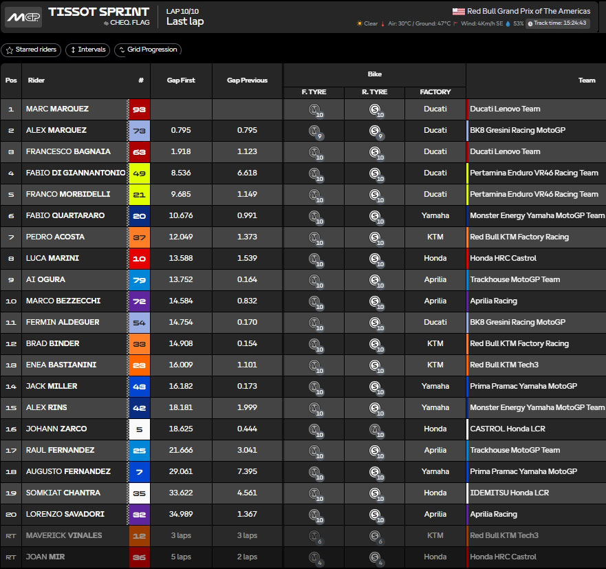 Résultats du Sprint du Grand Prix des Amériques MotoGP 2025 :