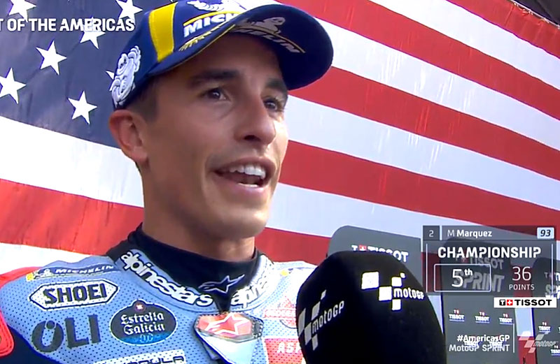 A peine descendu de sa Ducati GP23 du team Gresini après avoir obtenu la 2e place du Sprint du Grand Prix MotoGP des Amériques sur le COTA à Austin, Marc Marquez s’est confié devant les caméras du site officiel MotoGP.com avec ses pensées déjà focalisées sur le GP de dimanche…