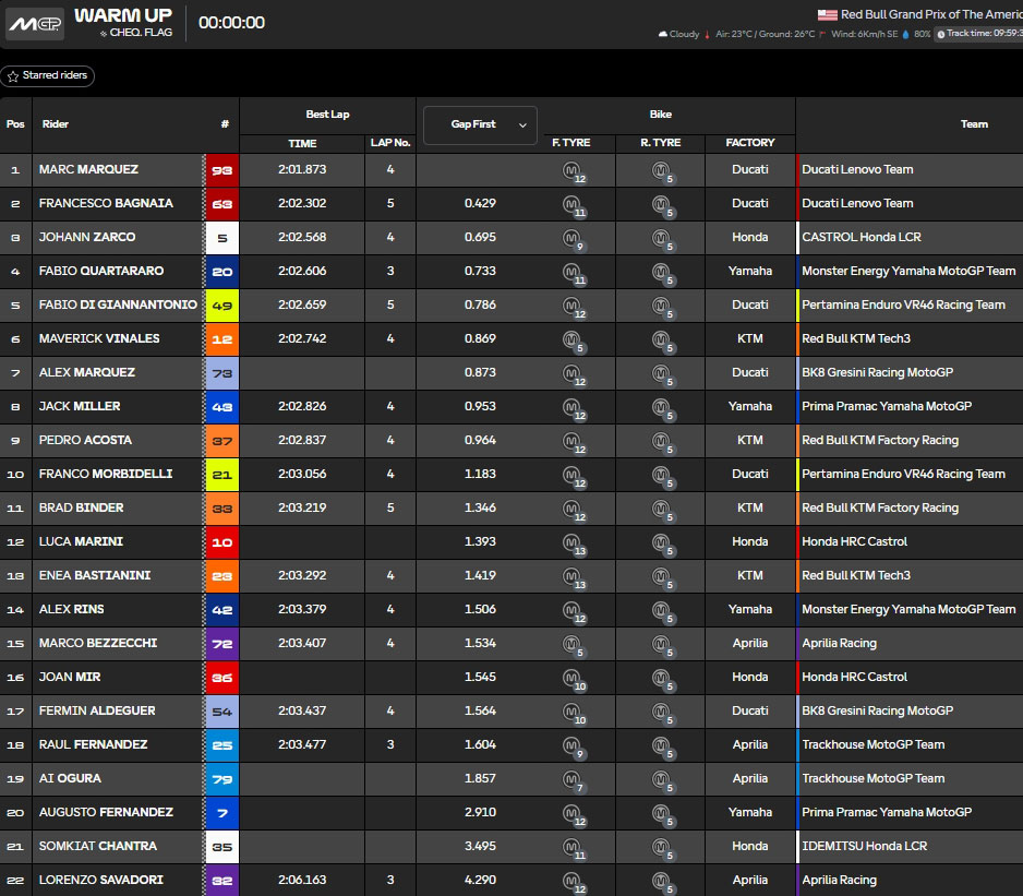 Résultats du warm up du Grand Prix des Amériques MotoGP 2025 :