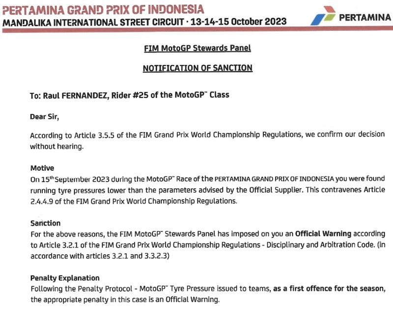 Mais avec une piste à plus de 60° au départ du GP d’Indonésie et un pneu avant tendre, quatre nouveaux pilotes MotoGP, ou au choix quatre teams, n’ont pas passé avec succès le décryptage des données enregistrés et ont été jugés en infraction avec la réglementation: Marco Bezzecchi (Mooney VR46 Racing Team) 5e, Aleix Espargaro (Aprilia Racing) 10e, Raul Fernandez (CryptoDATA RNF MotoGP Team) 13e et Franco Morbidelli (Monster Energy Yamaha MotoGP) 14e,