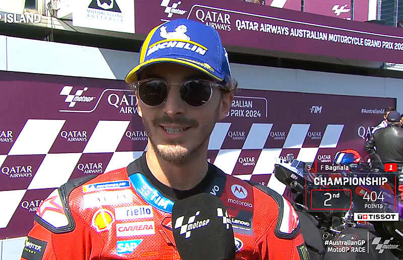 A peine descendu de sa Ducati GP24 officielle après avoir obtenu la 3e place du Grand Prix d’Australie MotoGP 2024 à Phillip Island, Francesco Bagnaia s’est confié devant les caméras du site officiel MotoGP.com avec la déception d’avoir été impuissant face à ses deux adversaires…