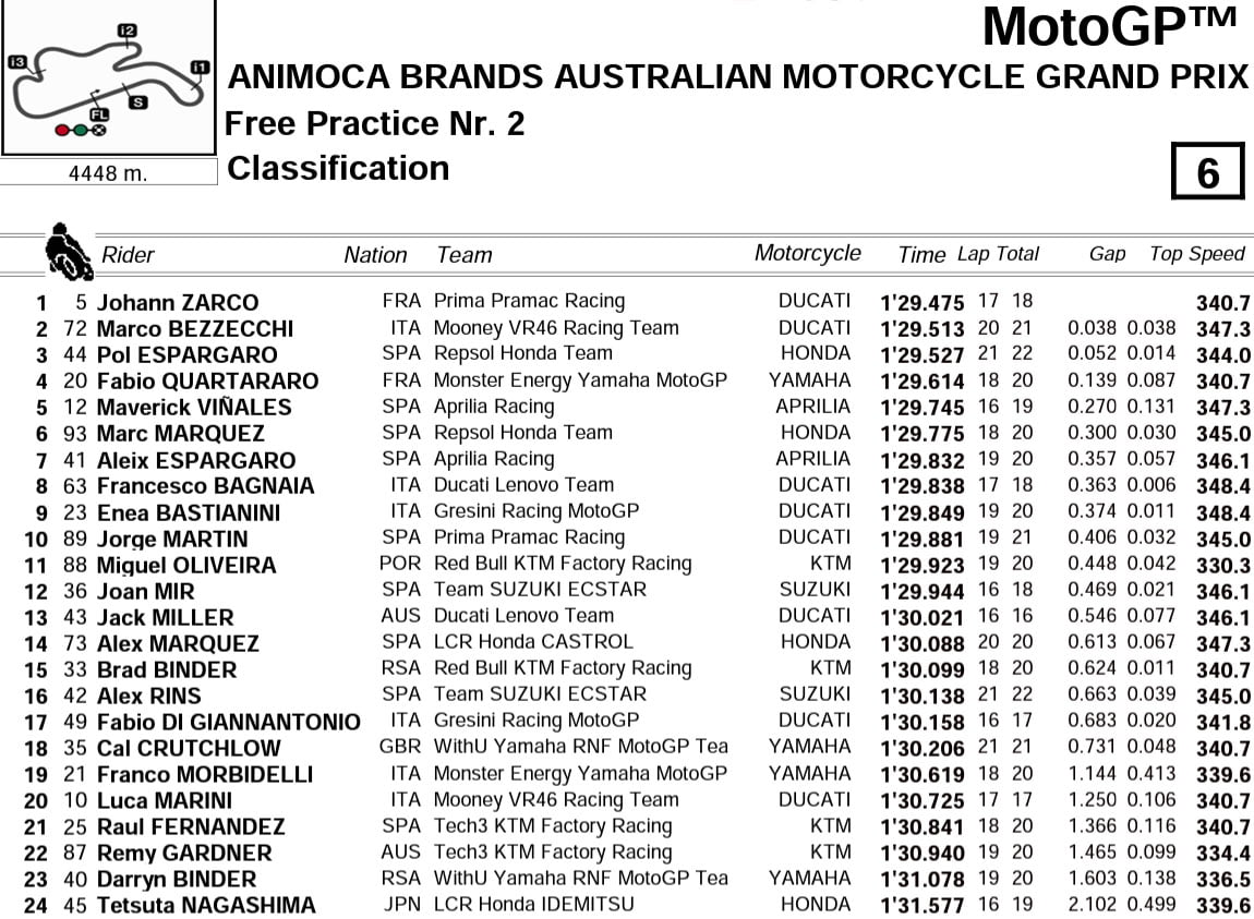 Sous le drapeau à damier en Australie, Zarco mène devant Bezzecchi, Pol Espargaró, Fabio Quartararo, Viñales et Marc Marquez. Aleix Espargaró est septième, Bagnaia huitième devant Bastianini et Martin qui ferme le top 10 à Oliveira. Miller est seulement 13è.