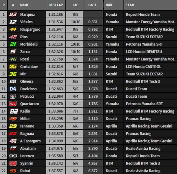 À l’issue du premier run, Marc Márquez et Maverick Viñales précèdent Pol Espargaró, Álex Rins, Franco Morbidelli, Johann Zarco, Valentino Rossi, Cal Crutchlow, Joan Mir et Miguel Oliveira.
