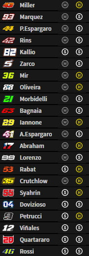 Voici les références disponibles pour cette FP4 de 30 minutes qui va démarrer avec un peu de retard dû au nettoyage de la piste après qu’une Moto3 ait déversé de l’huile: