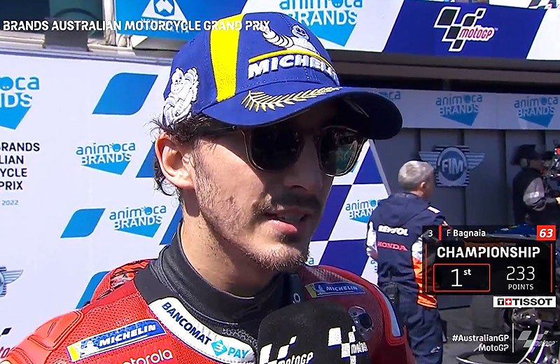 A peine descendu de sa Ducati GP22 officielle après avoir obtenu la 3e place du Grand Prix MotoGP d’Australie sur le circuit de Phillip Island, Francesco Bagnaia s’est confié devant les caméras du site officiel MotoGP.com avec la satisfaction de prendre la tête du championnat