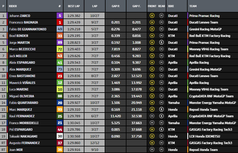 Fabio Di Giannantonio : « Oui, la course a été longue, c’est sûr. Comme l’a dit Pecco, peut-être que nous n’étions pas prêts à faire la longue distance, cette longue distance, samedi, mais c’était une course purement amusante. J’ai pris un bon départ puis j’ai été dépassé dès le début car j’essayais de gérer le pneu arrière, mais j’essayais aussi de pousser un peu, pour ne pas perdre trop de terrain au début, dans les premiers tours. Et puis, j’ai rattrapé Brad. Je l’ai doublé et je me suis dit « OK, maintenant essaye de creuser un peu l’écart ». Ce n’était pas possible parce qu’il y avait un peu de vent et quand vous êtes devant, c’est un peu plus difficile de pousser. Mais oui, je pense que nous avons réalisé une excellente performance. Nous avons été rapides tout au long du week-end et nous avons été constants tout au long de la course, à l’exception des 7 derniers tours qui ont été une grosse chute pour tout le monde pour le pneu. Et oui, le dernier tour ressemblait un peu à l’époque de la Moto3, à l’époque où beaucoup de pilotes se battaient pour quelque chose d’important. Alors oui, il y a eu beaucoup de dépassements, et j’ai peut-être perdu un peu la possibilité de gagner. Oui, c’était très, très amusant. »