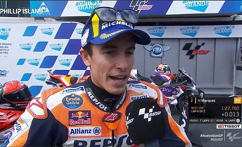 A peine descendu de sa Honda RC213 V officielle après avoir obtenu la 2e place sur la grille de départ du Grand Prix MotoGP d’Australie sur le circuit de Phillip Island, Marc Márquez s’est confié devant les caméras du site officiel MotoGP.com avec la satisfaction d’avoir bénéficié d’une belle aide de Francesco Bagnaia