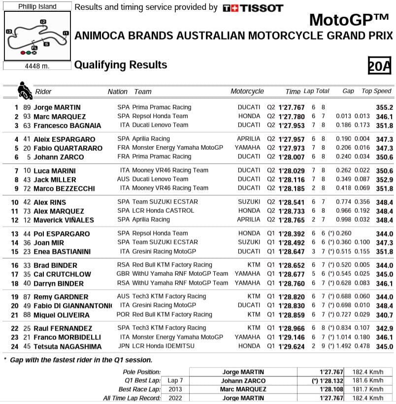 Résultats de la qualification du Grand Prix MotoGP d’Australie (sans la pénalité de Miguel Oliveira) :