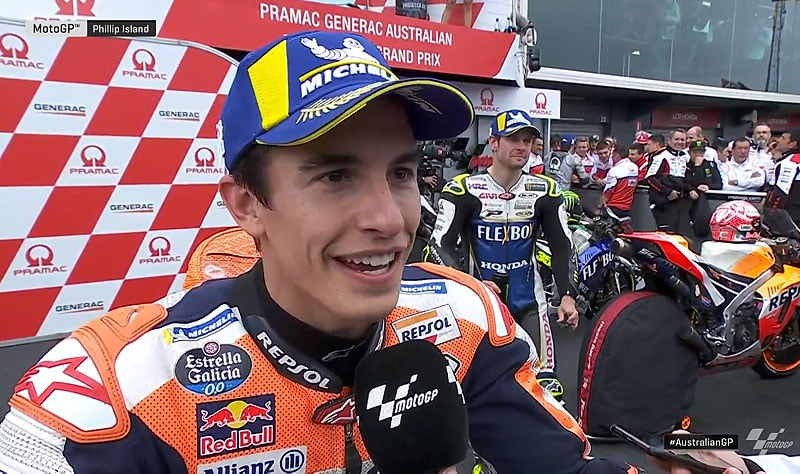 A peine descendu de sa Honda RC213V officielle après avoir remporté le Grand Prix MotoGP d’Australie, Marc Márquez s’est confié devant la caméra du site MotoGP.com avec la satisfaction de ne rien avoir lâché jusqu’au dernier tour…