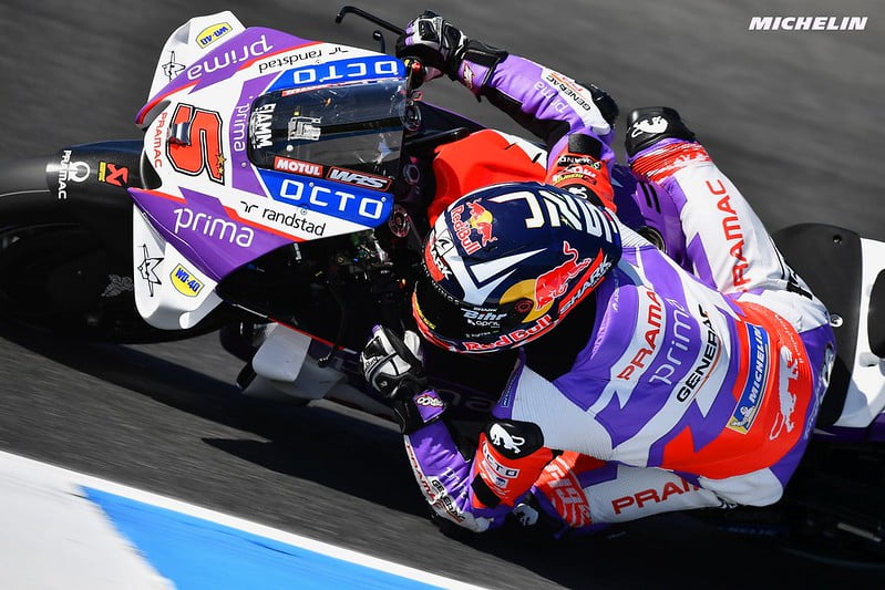 Johann Zarco : « Oui, j’ai eu beaucoup de wheeling en deuxième et troisième vitesses et la puissance s’est donc coupée. Mon système pour le départ n’a pas fonctionné et je n’ai pas pu faire redescendre la moto. Cela m’a coûté beaucoup de positions, mais ensuite, également, je n’ai pas pu bien inscrire la moto au premier virage avec la moto lourde. Je n’ai donc pas pu prendre le risque de doubler car les autres étaient bien plus à l’aise en début de course. Mais ce que j’ai vu, c’est qu’ils forçaient beaucoup sur le pneu, donc après juste trois tours, ce groupe de derrière peinait déjà avec le pneu. Donc à partir de ce moment, j’ai commencé à revenir et c’était bien d’avoir un bon rythme. J’ai vraiment beaucoup donné et il y avait beaucoup d’endroits où j’étais très fort. À d’autres, moins, et j’ai commis une erreur derrière Marini quand je suis arrivé sur le groupe de tête, et peut-être que cela m’a coûté un peu. Et avec l’énergie dépensée pour rattraper ce groupe, je voulais juste respirer un peu derrière Marini, mais à cause de cette erreur j’ai dû attaquer de nouveau pour rester avec eux. J’ai essayé de me battre et j’ai eu de bonnes bagarres, avec Brad, avec Aleix et aussi avec Bastianini. Nous avons fait une bonne course, mais la dernière bagarre, avec Aleix et Binder, m’a fait perdre le contact avec le groupe du top cinq où était Bastianini. Il y avait donc du bon rythme et c’est vraiment dommage pour le début, et c’est un signe que je peux être très rapide mais le feeling sur la moto n’est pas encore le bon. En ayant ça, dès que je veux mettre la moto dans le virage de façon naturelle, j’aurai toujours le même problème en début de course. Si nous pouvons trouver la solution, puisque mon style est différent, alors peut-être que je pourrais devenir vraiment fort. »