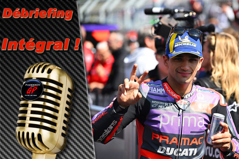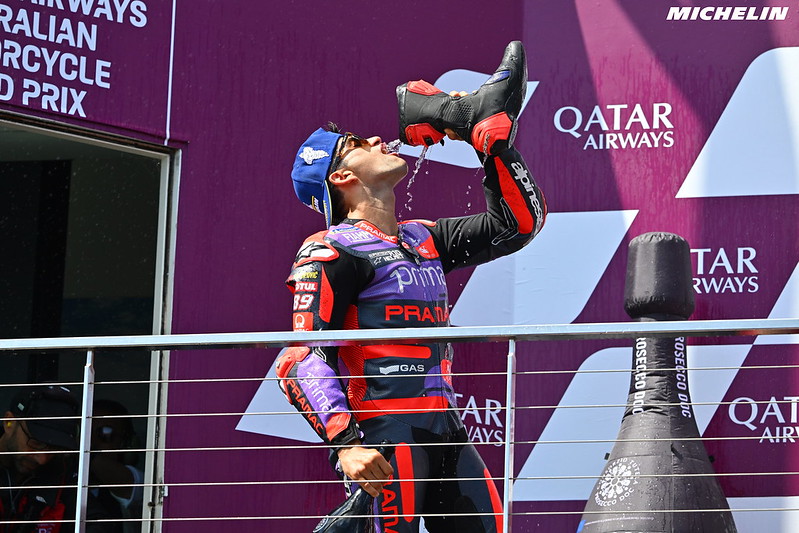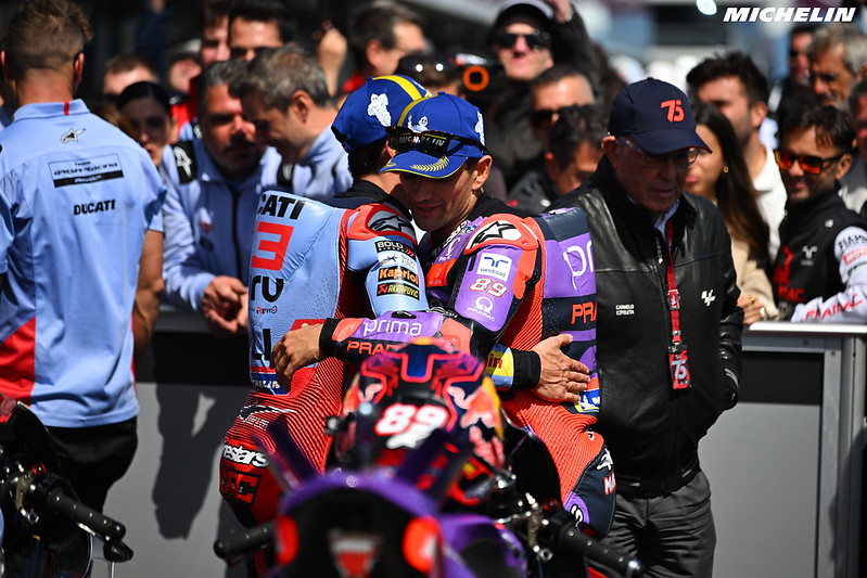 Jorge Martin : « Oui, merci. C’est certain, je ne peux pas dire que je ne suis pas content de la façon dont le week-end s’est déroulé. Après avoir fait la pole position ici, puis avoir gagné hier, aujourd’hui, je voulais gagner à coup sûr. Mais les sensations n’étaient pas les mêmes qu’hier avec le pneu arrière. J’avais du mal à passer la puissance au sol, et je n’ai donc pas pu creuser l’écart avec Pecco et Marc, qui aussi ont eux progressé par rapport à hier. Et oui, la course a quand même été assez forte. Il y a eu des moments où j’ai pensé que ça allait être difficile : j’ai failli chuter dans le premier virage et ils m’ont rattrapé, et tout de suite Pecco m’a dépassé. J’ai dû changer un peu d’état d’esprit, j’ai commençais à beaucoup pousser, et oui, même quand Marc m’a dépassé à la fin, j’ai essayé de revenir, j’ai essayé de gagner la course, mais c’est sûr que mes chances de gagner étaient moindres et je pense que j’ai tiré le meilleur parti de ce week-end. »