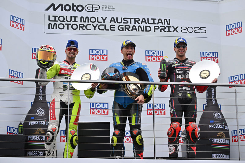 Le Liqui Moly Australian Motorcycle Grand Prix 2025 a été remporté par Raul Fernandez (Trackhouse MotoGP Team), auteur d’une course parfaitement gérée. Fabio Di Giannantonio (Pertamina Enduro VR46 Racing Team) a pris la deuxième place, devant Marco Bezzecchi (Aprilia Racing), troisième malgré deux pénalités de type « long lap ».