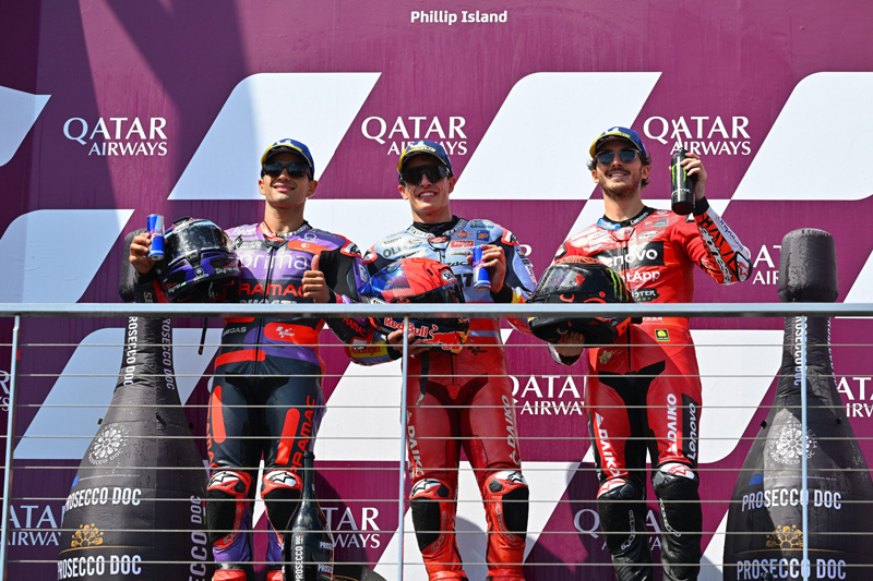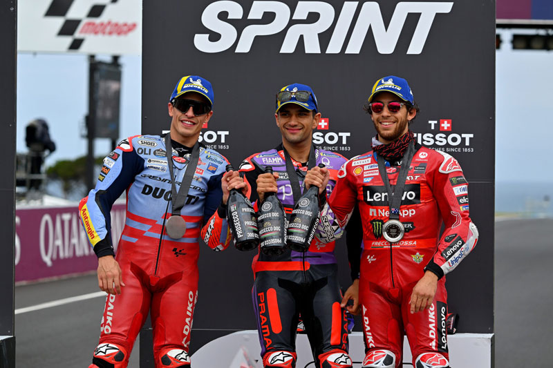 La Tissot Sprint s’est déroulée l’après-midi sur une piste balayée par le vent froid. Avec 14°C dans l’air et seulement 25°C sur l’asphalte, les pneus MICHELIN Power Slick ont offert des performances de premier plan. Principalement équipés d’un pneu MICHELIN Power Slick Hard à l’avant et d’un Soft à l’arrière (correspondant au pneu slick Medium 2023), les pilotes ont tout donné pendant 13 tours. En tête du peloton dès le départ, Jorge Martin a enchaîné les tours rapides pour remporter la course sprint. Marc Marquez (Gresini Racing MotoGP) a pris la deuxième place, tandis qu’Enea Bastianini (Ducati Lenovo Team) a complété le podium.