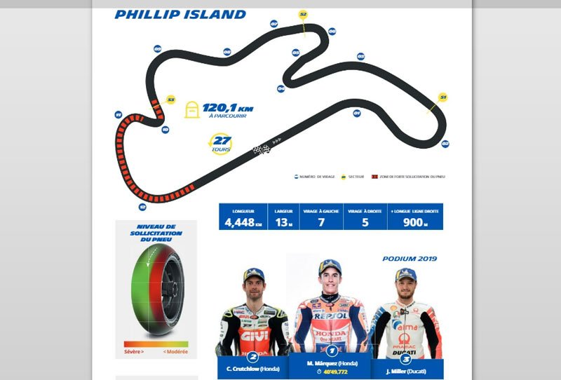 Avec tous ces éléments pris en compte, l’allocation de pneus MICHELIN Power Slicks est composée de gommes spécifiquement conçues pour ce circuit. Les pneus appelés « Phillip Island » répondent aux exigences des pilotes et de leurs machines pour leur permettre de pousser aux limites en totale confiance. Disponibles en Soft, Medium et Hard pour l’avant et l’arrière, les MICHELIN Power Slicks sont tous asymétriques avec un côté gauche plus dur pour combattre les fortes charges qui s’appliquent sur cette épaule du pneu. On retrouve une allocation entièrement asymétrique sur deux autres circuits, le Sachsenring et Valencia.