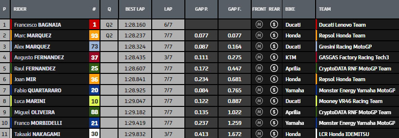 En attendant d’en découvrir davantage, en l’occurrence l’ordre de chacun sur la grille à la suite des qualifications de tout à l’heure, au moment où les 21 pilotes officiels (Alex Rins est forfait) se préparent à prendre la piste sèche malgré un ciel nuageux et des fraîches températures de 18° dans l’air et 21° au sol, voici le tableau qui résume les faits connus jusque-là.
