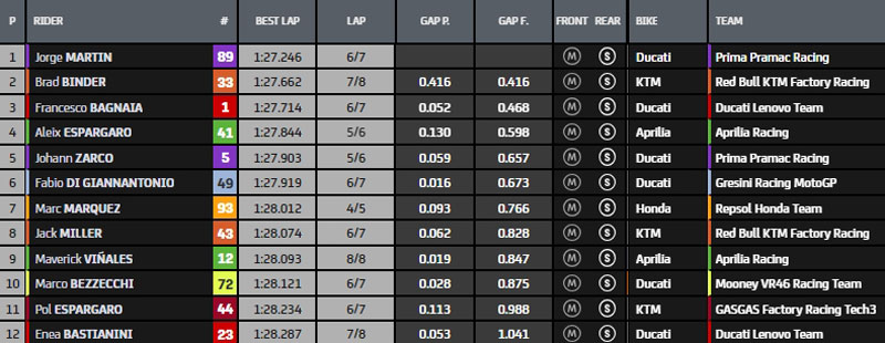 Mais en attendant de savoir si le Sprint reporté à dimanche aura bien lieu ou pas (avec les 12 points qui en découlent), la practice du vendredi a déjà rendu son verdict, présélectionnant les 10 plus rapides pour un accès direct aux quatres premières lignes de la grille de départ : Brad Binder, Jack Miller, Maverick Vinales, Jorge Martin, Pol Espargaro, Marco Bezzecchi, Fabio Di Giannantonio, Enea Bastianini, Aleix Espargaro et Johann Zarco.