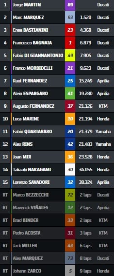4 tours s’affichent encore au compteur…Martin mène la danse devant MMarquez, Bastianini, Bagnaia, Bezzecchi, Vinales, Di Giannantonio, Morbidelli, Binder et RFernandez