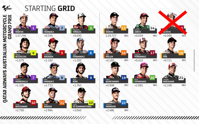 Oui, 21, car la bonne nouvelle est que Marco Bezzecchi a été déclaré apte à courir, après son effroyable chute de la veille lors du Sprint. Pénalisé, mais apte à courir.