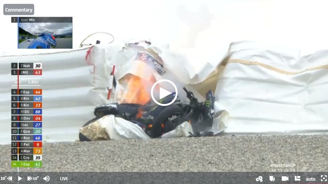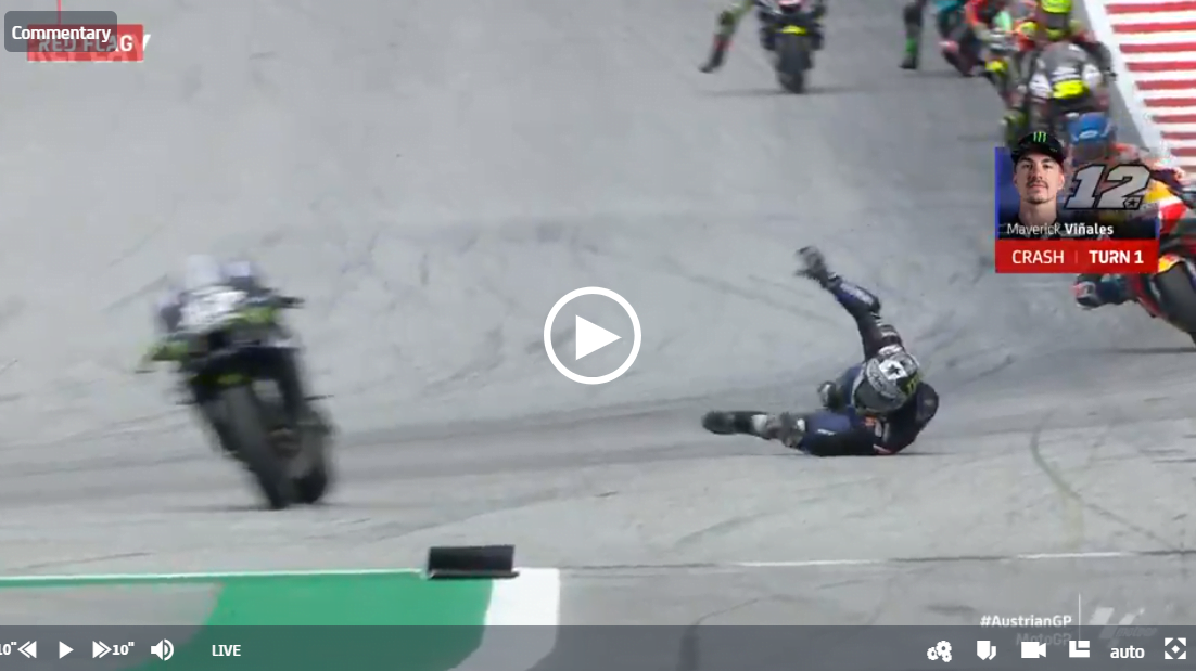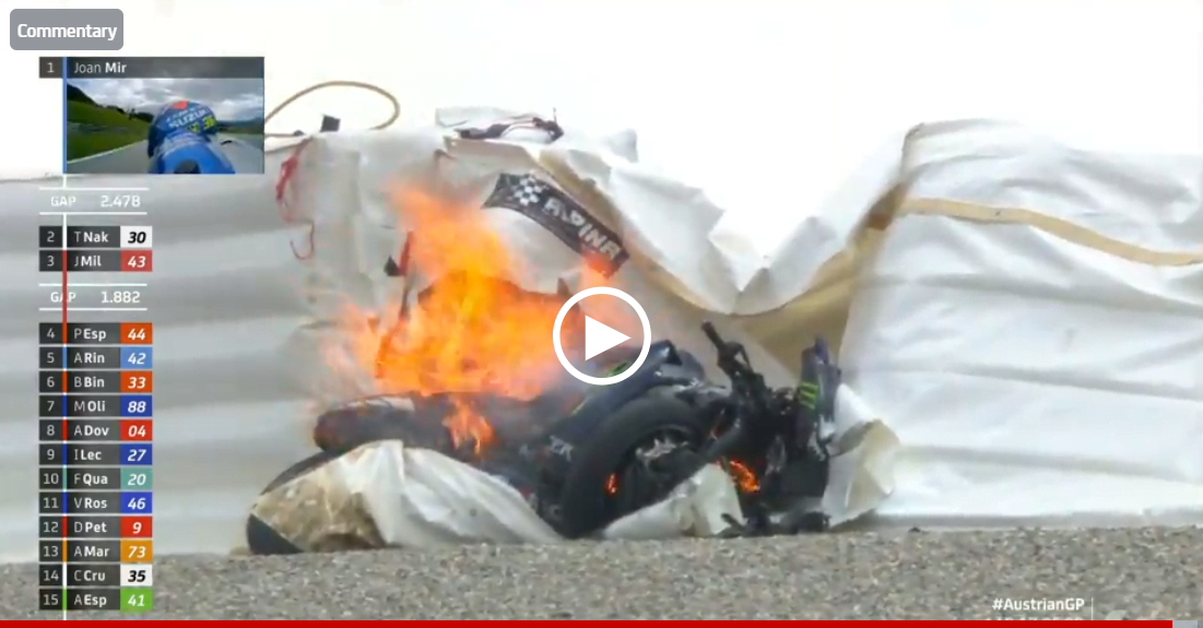 Le problème technique Yamaha vient de prendre une nouvelle ampleur avec cette première partie de course du Grand Prix de Styrie. Première partie car le drapeau rouge est déployé. Pourquoi ? Parce que Maverick Vinales s’est éjecté de sa M1 visiblement sans freins avant l’abord du virage 1. Il était à plus de 260 km/h…