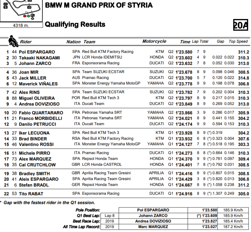 Mais revenons à la compétition. Maverick Viñales, sixième à la régulière, est celui qui a l’honneur chez Yamaha sur le Red Bull Ring, mais pas les apparences. Il explique : « la deuxième ligne sur la grille est bonne » commence le Top Gun qui était pourtant en pole position sur le même tracé il y a seulement une semaine.