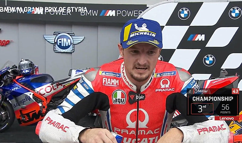 A peine descendu de sa Ducati GP20 du team Pramac après avoir terminé deuxième du Grand Prix de Styrie sur le Red Bull Ring, Jack Miller s’est confié devant la caméra du site MotoGP.com avec la satisfaction…