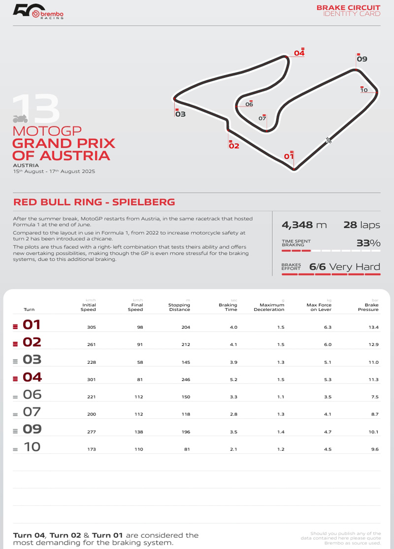 Selon les ingénieurs Brembo qui travaillent en étroite collaboration avec tous les pilotes MotoGP, le Red Bull Ring de Spielberg, long de 4,348 km, figure parmi les circuits les plus exigeants pour les systèmes de freinage.