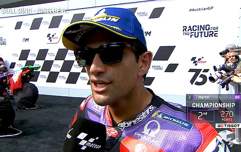 A peine descendu de sa Ducati GP24 du team Pramac après avoir terminé 2e du Grand Prix d’Autriche MotoGP 2024 au Red Bull Ring, Jorge Martin s’est confié devant les caméras du site officiel MotoGP.com avec de nouveau une frustration qu’il ne cache plus…