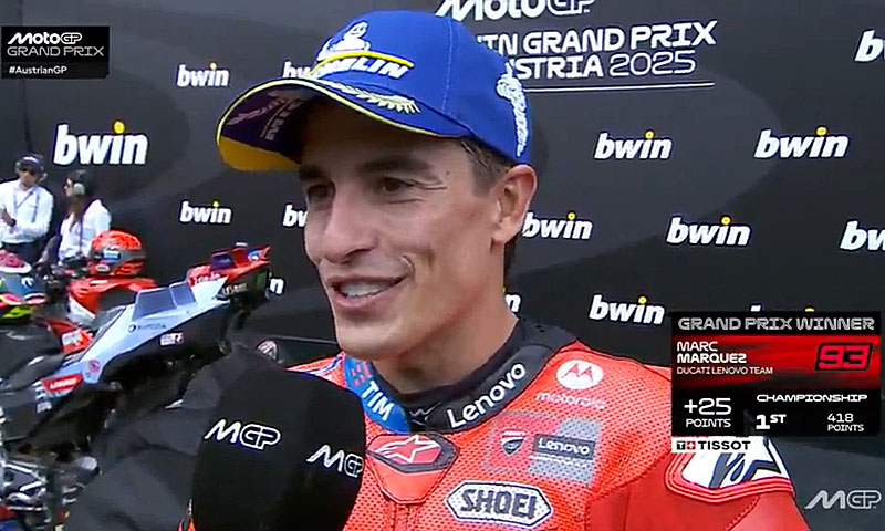 A peine descendu de sa Ducati GP25 du team d’usine Ducati Lenovo après avoir remporté le Grand Prix d’Autriche MotoGP 2025 au Red Bull Ring, Marc Marquez s’est confié devant les caméras du site officiel MotoGP.com avec la joie d’avoir enfin vaincu la malédiction du Ring…