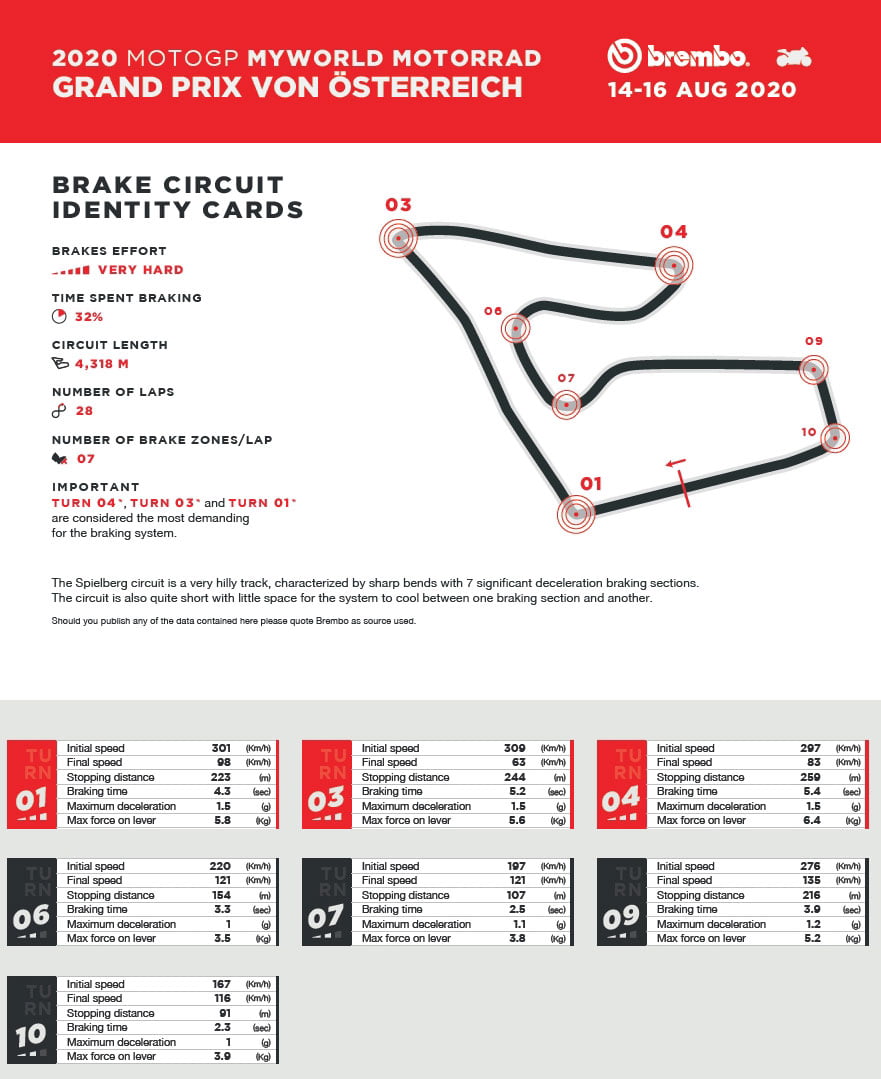 Selon les techniciens Brembo qui travaillent en étroite collaboration avec tous les pilotes du Championnat du Monde MotoGP, le Red Bull Ring est l’un des circuits les plus exigeants en matière de freins. Sur une échelle de 1 à 5, il a obtenu un 5 sur l’indice de difficulté, égalé uniquement par la piste de Barcelone.