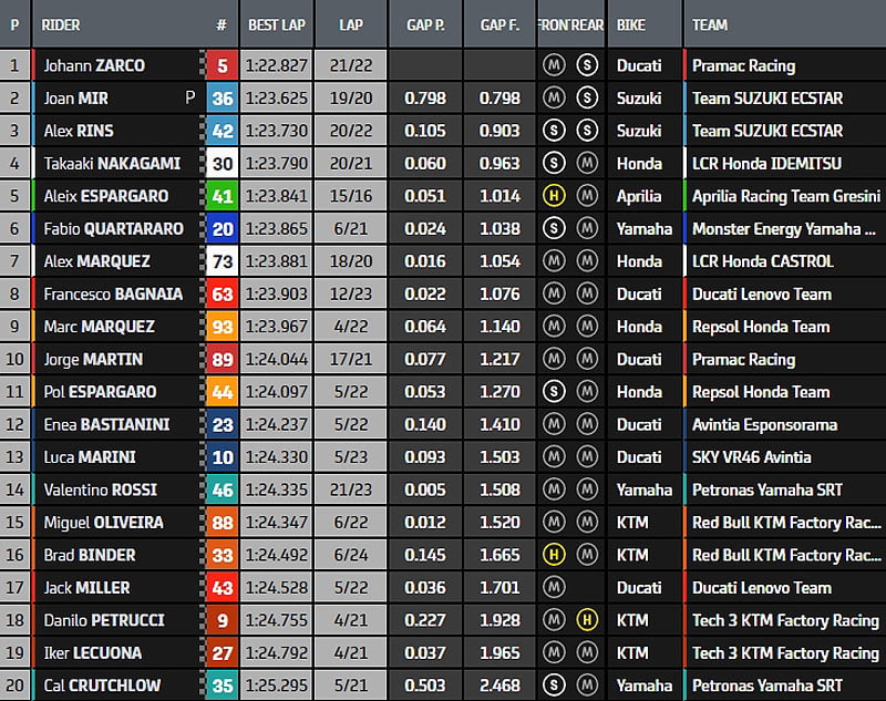 Derrière le représentant du soleil levant, on trouve Fabio Quartararo, Marc Márquez, Johann Zarco, Joan Mir, Francesco Bagnaia, Jorge Martin, Pol Espargaro, Alex Márquez et Alex Rins pour constituer le premier top 10 provisoire du week-end, suivis d’Aleix Espargaro, Enea Bastianini, Luca Marini, Miguel Oliveira, Brad Binder, Jack Miller, Danilo Petrucci, Valentino Rossi, Iker Lecuona et Cal Crutchlow.