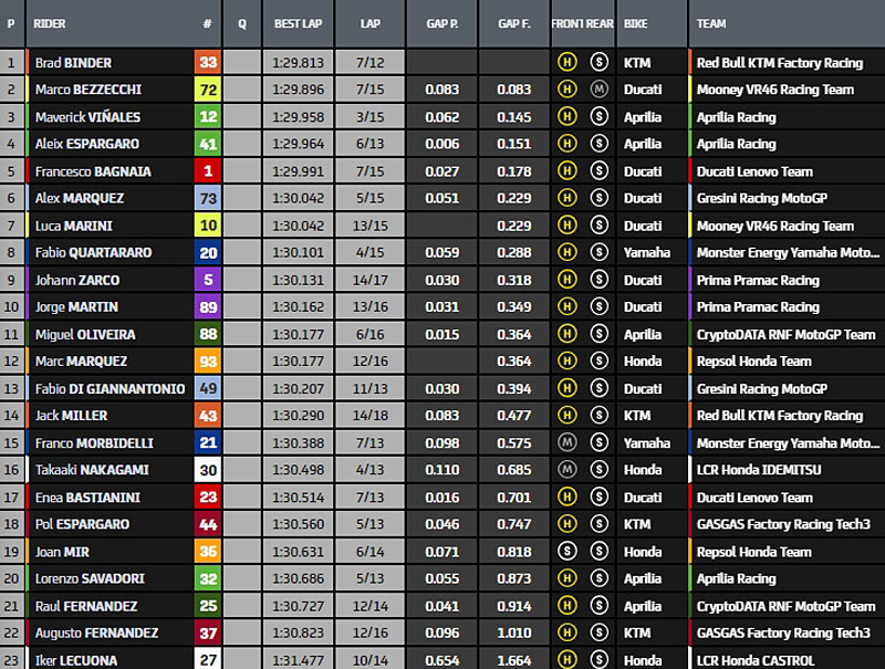 À la fin du premier run, alors que Marco Bezzecchi tire tout droit dans les graviers, le classement est composé de Brad Binder, Marco Bezzecchi, Maverick Vinales, Aleix Espargaro, Francesco Bagnaia, Alex Márquez, Fabio Quartararo, Miguel Oliveira, Marini, par exemple, Jack Miller, Fabio Di Giannantonio, Franco Morbidelli, Johann Zarco, Takaaki Nakagami, Pol Espargaro, Marc Márquez, Joan Mir, Lorenzo Savadori, Enea Bastianini, Augusto Fernandez, Raul Fernandez et Iker Lecuona.