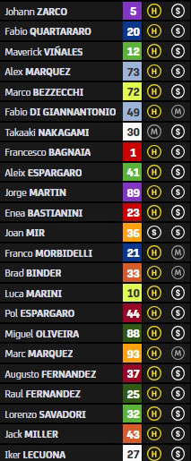 Après trois tours lancés, il précède Francesco Bagnaia, Fabio Quartararo, Marco Bezzecchi, Jorge Martin, Alex Márquez, Takaaki Nakagami, Brad Binder, Jack Miller, Aleix Espargaro, Miguel Oliveira et Lorenzo Savadori.