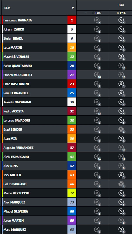 On notera que Marc Marquez (Gresini Racing MotoGP™), très prudent en FP1, ne figure pas dans la liste malgré une attaque de dernière minute lors de la Practice qui lui a valu le 4e temps.