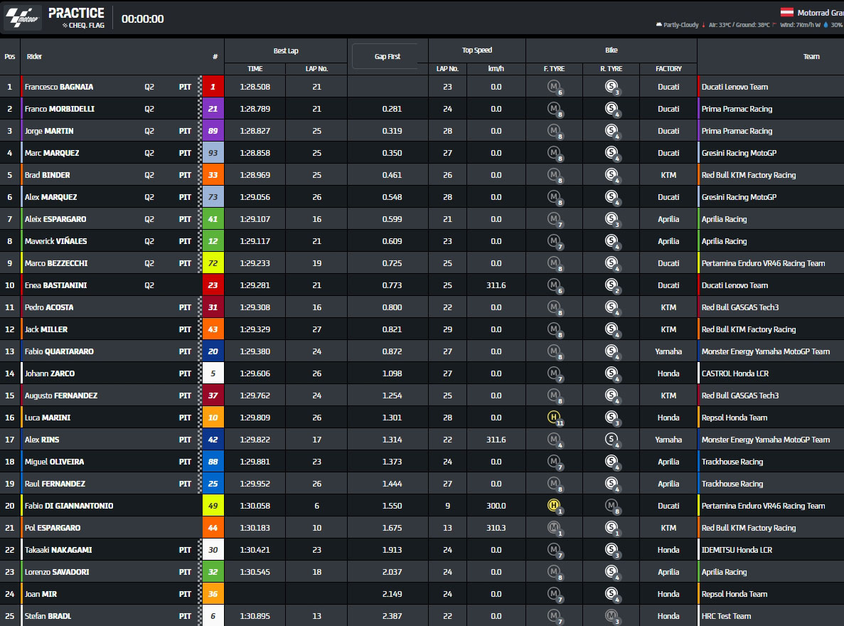 Classement de la FP2 du Grand Prix d’Autriche MotoGP 2024 au Red Bull Ring :