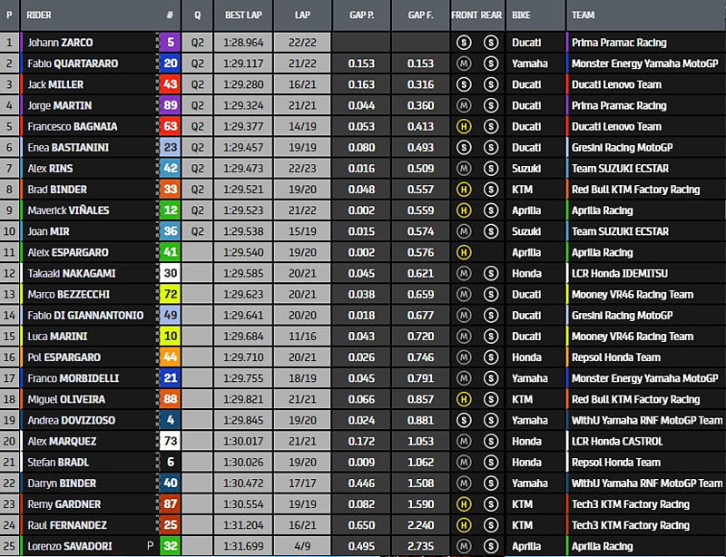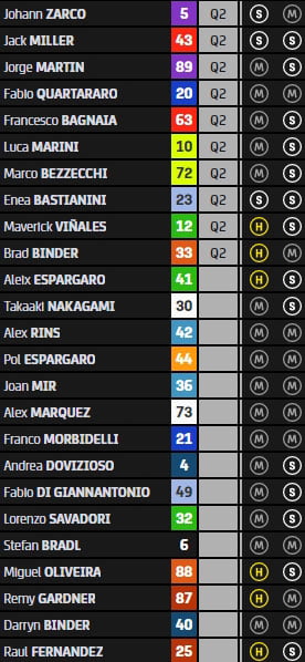 Johann Zarco, Fabio Quartararo, Jack Miller, Jorge Martin, Francesco Bagnaia, Enea Bastianini, Alex Rins, Brad Binder, Maverick Vinales et Joan Mir sont donc définitivement préqualifiés pour un passage direct en Qualification 2.