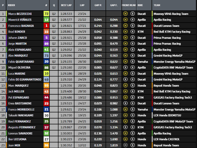 Aleix Espargaró : « Je suis satisfait parce que sur les circuits ‘stop&go’ comme celui-ci, j’ai toujours eu du mal à arrêter la moto au freinage et à l’accélération, mais aujourd’hui nous avons constaté une nette amélioration avec la moto, qui semble être plus équilibrée à cet égard. Si vous avez déjà une moto solide, il est difficile de faire de grands progrès, mais les petites améliorations ici et là nous aident quand même. Nous pouvons mieux freiner la moto maintenant, et nous sommes également devenus plus forts en termes d’accélération. De plus, la moto est moins sujette aux wheelings, donc globalement elle semble mieux équilibrée pour ce type de piste. La moto est meilleure que par le passé. Mais Maverick a fait la différence car il était très rapideJ’ai également pu utiliser les données de Maverick, ce qui a vraiment fait la différence aujourd’hui, à la fois sur un tour et en termes de rythme. C’était extrêmement efficace. Je sais qu’il y a une marge d’amélioration, alors j’essaierai d’y parvenir demain, même si la pole position n’est pas réaliste pour nous sur cette piste. Mais je pense que nous pouvons nous battre pour les deux premières lignes et ensuite tout est possible dimanche. »