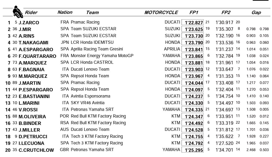 Classement FP1/FP2 du Grand Prix MotoGP d’Autriche sur le Red Bull Ring :
