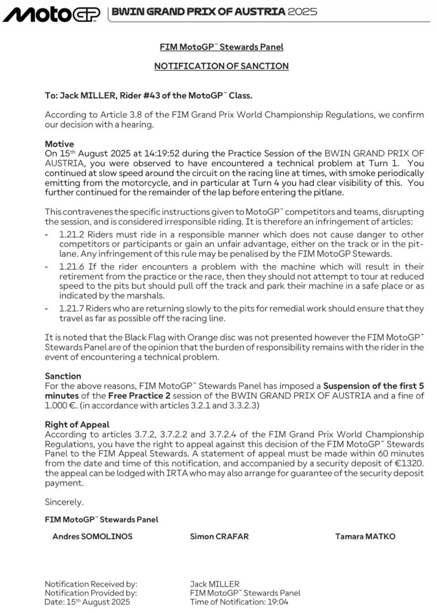 En conséquence, la sanction peut être jugée relativement légère, avec interdiction de rouler pendant les cinq premières minutes de la FP2 et une amende de 1000 €.