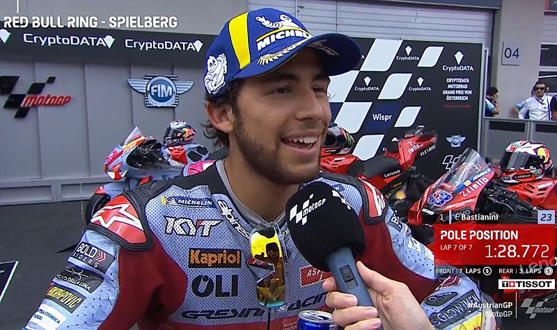 A peine descendu de sa Ducati GP22 satellite du tem Gresini après avoir arraché la pole position du Grand Prix d’Autriche MotoGP sur le circuit du Red Bull Ring, Enea Bastianini s’est confié devant les caméras du site officiel MotoGP.com avec la satisfaction d’avoir obtenu sa première pole position en catégorie reine…