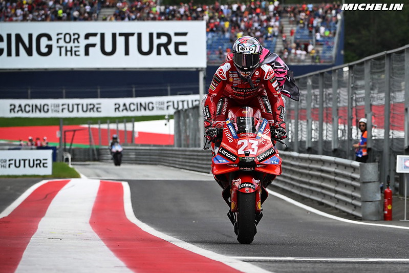 Bonjour, bienvenue à la conférence de presse d’après course ici au Red Bull Ring à Spielberg, à la fin des 28 tours du Grand Prix d’Autriche. Le vainqueur de la course est de retour au sommet du Championnat du Monde MotoGP, le champion du monde en titre, le pilote de l’équipe Ducati Lenovo Pecco Bagnaia. 9ème victoire Ducati en 11 Grands Prix ici au Red Bull Ring, Pecco 7ème victoire de la saison, et 5 points d’avance en direction d’Aragon dans deux semaines. Depuis la pole position, la deuxième place du Sprint et la deuxième place du Grand Prix d’aujourd’hui revient à Jorge Martin, de Prima Pramac Racing, et le pilote de l’équipe Ducati Lenovo, Enea Bastianini, complète un autre podium entièrement Ducati, un autre podium entièrement Ducati GP24.