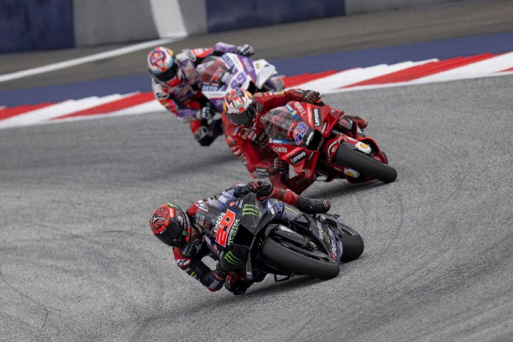 Dans cette saison, il y a eu le dépassement de Johann Zarco sur Aleix Espargaró au Sachsenring et il y a depuis ce Grand Prix d’Autriche la conquête de la seconde position en vue de l’arrivée de Fabio Quartararo au détriment de Jack Miller. Le tout sur un Red Bull Ring où, a priori, un pilote Yamaha n’a rien à espérer face à une Ducati. Mais le Français a rappelé que le Champion du Monde en titre, c’était bien lui…
