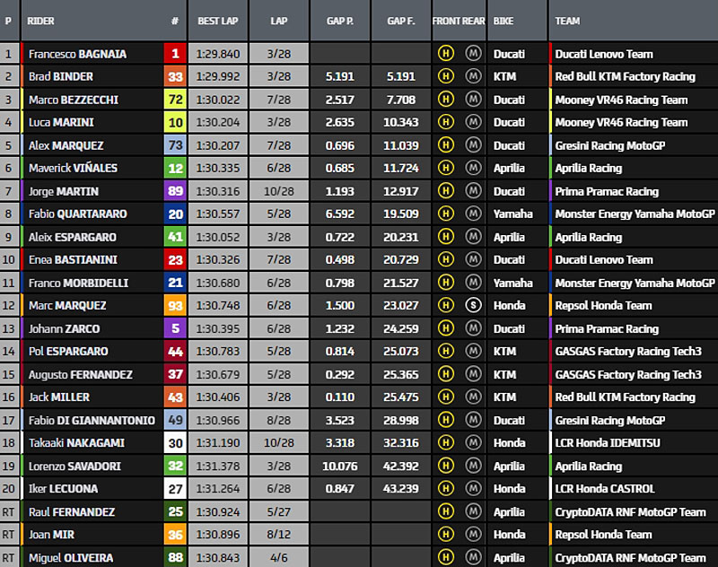 Voici les résultats du Grand Prix d’Autriche MotoGP 2023 :