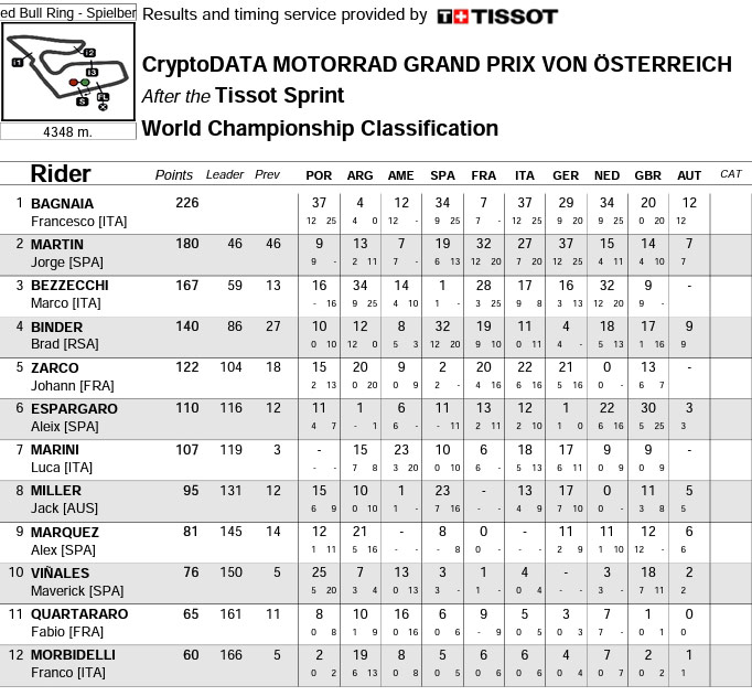 Quoi qu’il en soit, Francesco Bagnaia augmente encore son avance, de 5 points sur Jorge Martin, de 12 sur Marco Bezzecchi, de 3 sur Brad Binder et de 12 sur Johann Zarco. Cela peut paraître peu de choses alors qu’il en reste 395 à possiblement inscrire, mais les petits point grappillés aujourd’hui lors du Sprint ont sans doute un effet inversement sur-multiplicateur sur le moral des adversaires de Pecco !