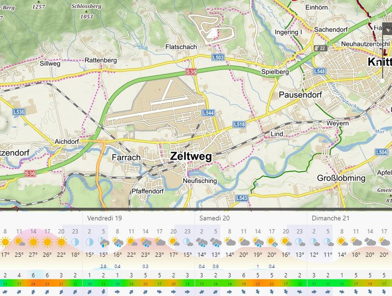 Le tracé autrichien étant établi entre les montagnes de Styrie, le temps peut y changer très rapidement et très souvent, mais pour le moment les anticipations nous promettent des intempéries, à un moment ou un autre mais plus probablement le vendredi.
