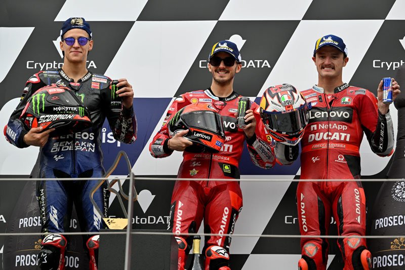 Francesco Bagnaia a devancé tous ses adversaires sur la ligne d’arrivée de Spielberg pour remporter le CryptoDATA Motorrad Grand Prix von Österreich sur le Red Bull Ring. Fabio Quartararo (Monster Energy Yamaha MotoGP) a terminé deuxième après un remarquable dépassement à la nouvelle chicane sur Jack Miller (Ducati Lenovo Team), troisième.