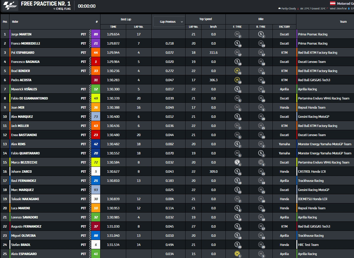 Classement de la Practice MotoGP du Grand Prix d’Autriche 2024 au Red Bull Ring :