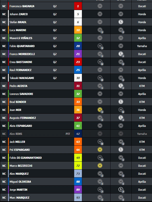 Pour le moment, Jorge Martin, Marc Márquez, Aleix Espargaro, Francesco Bagnaia, Franco Morbidelli, Marco Bezzecchi, Enea Bastianini, Pedro Acosta, Brad Binder et Fabio Quartararo sont pré-qualifiés pour la Q2. Pour le moment…