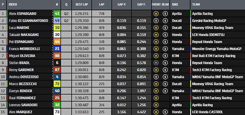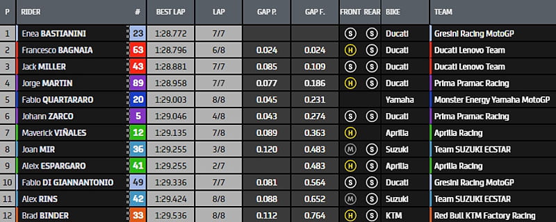 Ce matin, finalement, Johann ZarcoFabio QuartararoJack MillerJorge MartínFrancesco BagnaiaEnea Bastianini, Álex RinsBrad BinderMaverick Viñales et Joan Mir ont finalisé leur place dans les 12 premiers sur la grille : en fait, rien n’a vraiment changé, sauf l’éviction des deux pilotes VR46 au profit des pilotes Suzuki…